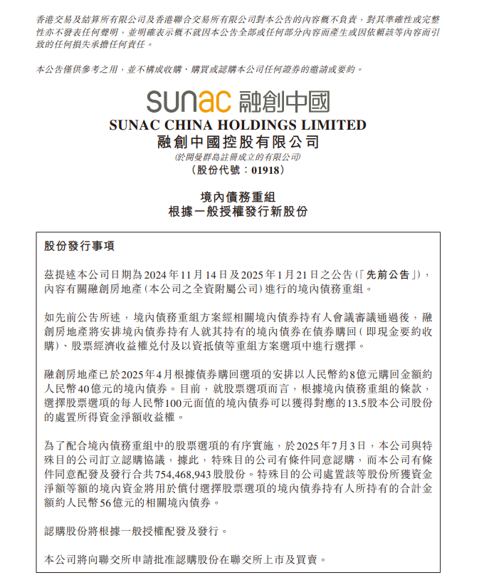 7月4日,融创中国(01918.HK)在港交所公告,融创房地产已于2025年4月根据债券购回选项的安排以人民币约8亿元购回金额约人民币40亿元的境内债券。目前,就股票选项而言,根据境内债务重组的条款,选择股票选项的每人民币100元面值的境内债券可以获得对应的13.5股本公司股份的处置所得资金净额收益权。