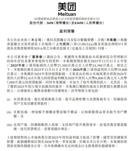 美团在最新公告中披露,尽管受持续竞争影响,亏损趋势预计将在2026年第一季度延续,但截至公告日期,公司的经营状况维持稳健及正常,且公司拥有充足的现金以支撑业务的稳健发展。
