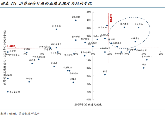 与中上游与TMT的业绩整体改善不同,2025年Q3下游消费板块表现相对疲软:营收累计增速略抬升0.1个百分点至-0.4%;而利润增速大幅下降7.7个百分点至-1.2%,时隔两年后再度落入负增长区间。宏微观的裂口层面,与社零的增速差达到-4.9%,边际改善0.6个百分点,然而依然处于2016年以来的历史极值附近;结构上看,消费细分行业营收增速高于社零的比例仅略高于30%,即上市公司口径下消费板块的低迷可能也不能仅仅用内需不足或是传统权重板块表现拖累来解释。而结构上看,收入端具备韧性的细分行业集中于政策支持领域(家电、汽车、家居)以及部分细分的新消费(动物保健、休闲食品、个护用品等)。