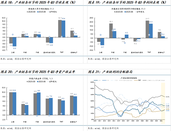 从产业链视角来看,2025年Q3中游制造业绩出现改善,营收与利润同比增速分别为2.1%与18.1%,相较Q2边际抬升1.3与9.5个百分点,利润占比边际抬升1.4个百分点至15.8%;相较之下实物领域(上游+基础设施)整体营收与利润表现略有改善,然而依然相对落后,利润占比也延续2024年Q3以来的下滑趋势,当前回落至2024年Q1附近。而下游消费领域,营收增速边际改善1.2个百分点至2.0%,而利润增速则下滑6.0个百分点至-1.8%,利润占比下滑1.2个百分点至25.1%,创下2024年Q3以来新低。相较下TMT板块是业绩表现相对占优的领域,利润占比持续抬升至16.0%。
