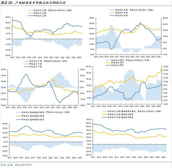 而从利润占比与市值占比匹配度的情况来看,中游与TMT作为利润占比回升的领域,其市值占比也同样快速回升,然而对于TMT而言,当前市值占比与利润占比差值相较于2020年的“极度抢跑”仍有一定距离,而中游甚至出现下降,即本轮中游利润占比的回升速度高于市值占比的扩张速度。值得一提的是,下游的利润占比与市值占比整体基本匹配,其2020年至2021年相较于市场的估值扩张基本消化完毕。