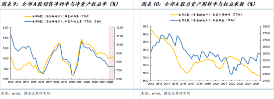 截至2025年10月31日,全部A股2025年三季报披露完毕。全部A股营收展现韧性,Q3单季度同比增速为3.8%,连续两个季度维持正增长的同时,自2023年来首次超过名义GDP。这背后体现的是:一方面国内反内卷限制了投资与部分行业企业的生产活动;另一方面较高证券化率的出口行业维持高景气且有企业开始陆续出海,对上市公司业绩拉动比GDP更为明显。但不排除未来景气度逐步扩散到更多实体企业,从而出现宏观经济整体的企稳回升,在2025年Q3我们看到全部A股(非金融地产)的库存增速回升至4.5%,产业链补库周期正在开启。在更为重要的盈利层面,2025年Q3全部A股(非金融地产)归母净利润累计同比增速扭转了Q2的下行趋势,边际改善0.9个百分点至3.8%,在反内卷政策与外需强韧性的共同带动下,净资产收益率(TTM)回升至7.5%,连续两个季度改善,利润率的修复为主要驱动,“盈利底”正在不断得到夯实。往后看,随着PPI的逐渐企稳,我们预计利润率的回升有望延续。对于周转率而言,未来相对乐观的情形是海外财政与流动性双宽驱动下外需延续向上,而内需底部企稳回升带动营收上市公司分子端的弹性;而中性视角下需求延续当前弱回升趋势,随着分母端新增产能释放压力的缓解(在建工程增速逼近0增长),周转率同样有望逐渐实现底部企稳回升;悲观情形便是本轮需求侧复苏弹性有限,本轮产业链补库周期持续性较弱,然而在反内卷政策的约束与新增产能有限情况下,供给侧降价去库压力也大概率会弱于2024年Q2。